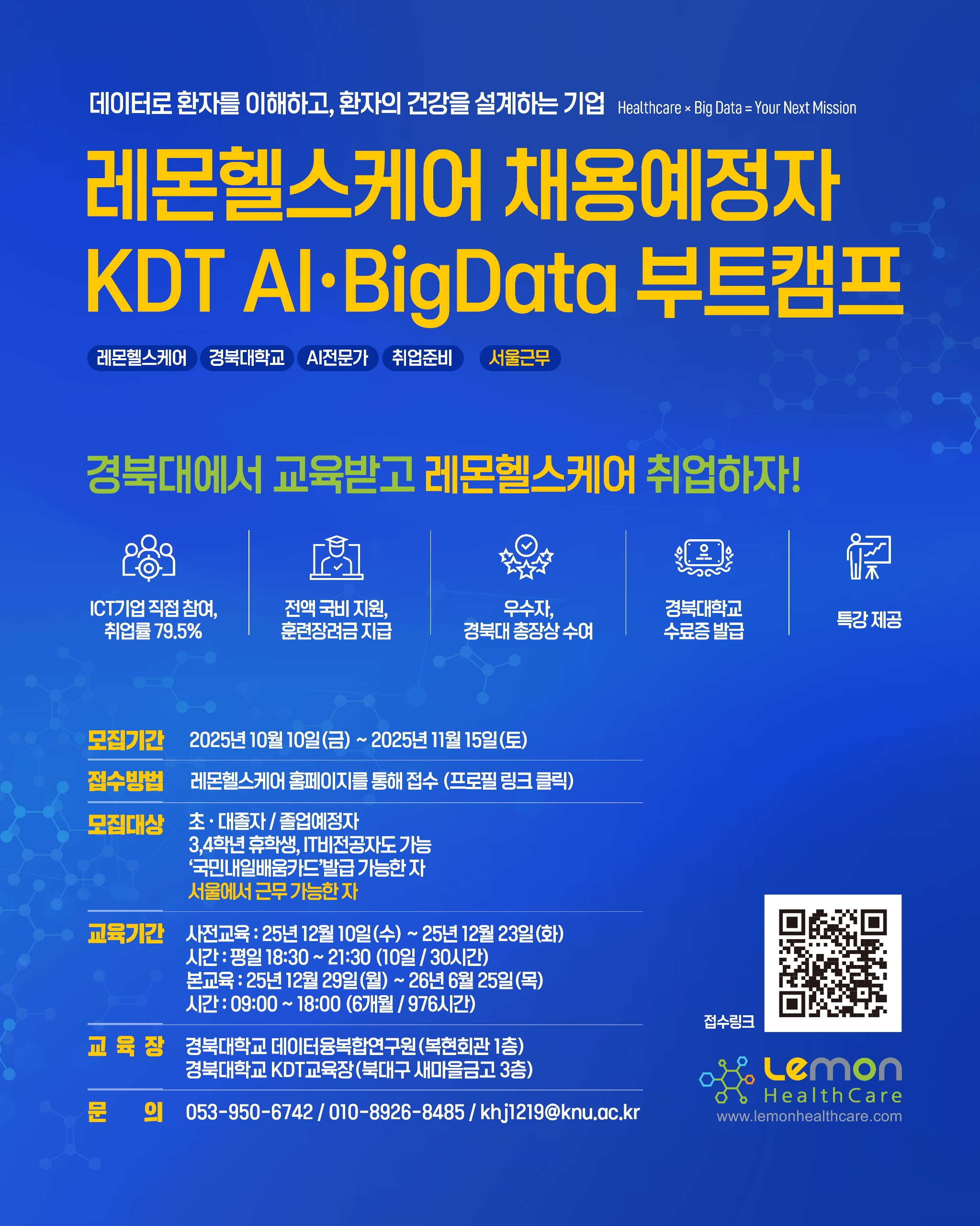 레몬헬스케어, 경북대학교와 함께하는 'AI·BigData 부트캠프' 채용연계 과정 모집